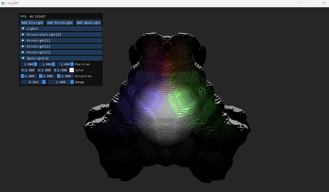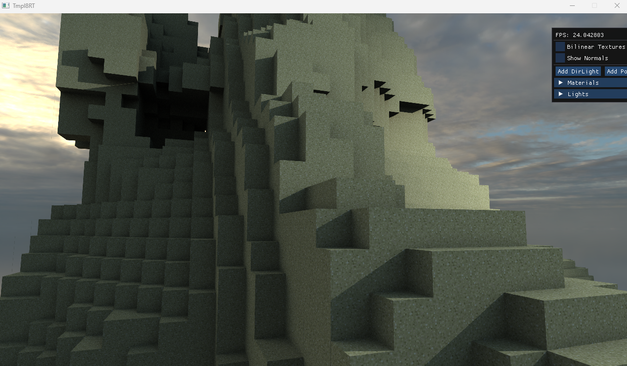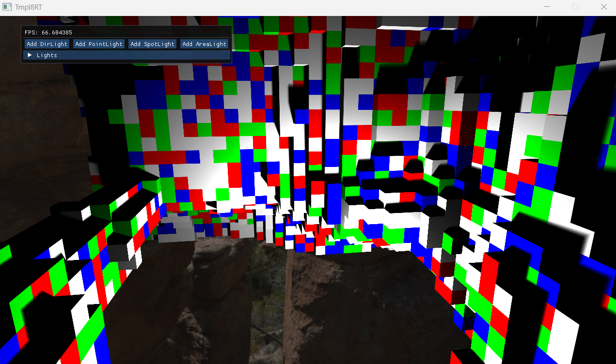 I implemented several lighting models to bring the voxel world to life. This included directional lights, point lights, spot lights, and spherical area lights for more realistic illumination. I added support for textures and reflections to give materials more visual depth. For more advanced lighting, I implemented image-based lighting using a Monte Carlo approach with stochastic sampling. This created a somewhat noisy result with trailing artifacts, but it gave the scene more realistic ambient lighting. I also implemented Beer’s law for volumetric absorption, which worked well for water and smoke effects. While I didn’t manage to implement refraction for water, the absorption effects still gave somewhat convincing results. I also implemented a multi-leveled brickmap for improved grid tracing performance for sparce grids. This was very effective especially when using it for the game, because it consists of mostly empty space.